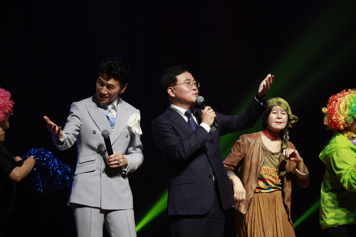 | ▲ 진교훈 구청장(가운데)이 강서구민회관에서 열린 ‘제29회 노인의 날 기념행사’에 참석해 깜짝 공연을 펼치고 있다. (사진=강서구청 제공) |