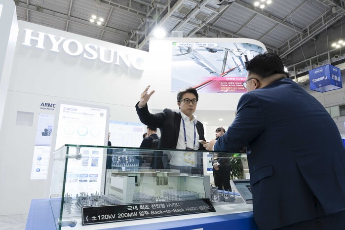 | ▲ 효성중공업 직원들이 고객들에게 HVDC 기술을 소개하고 있다.(사진=효성중공업 제공) |