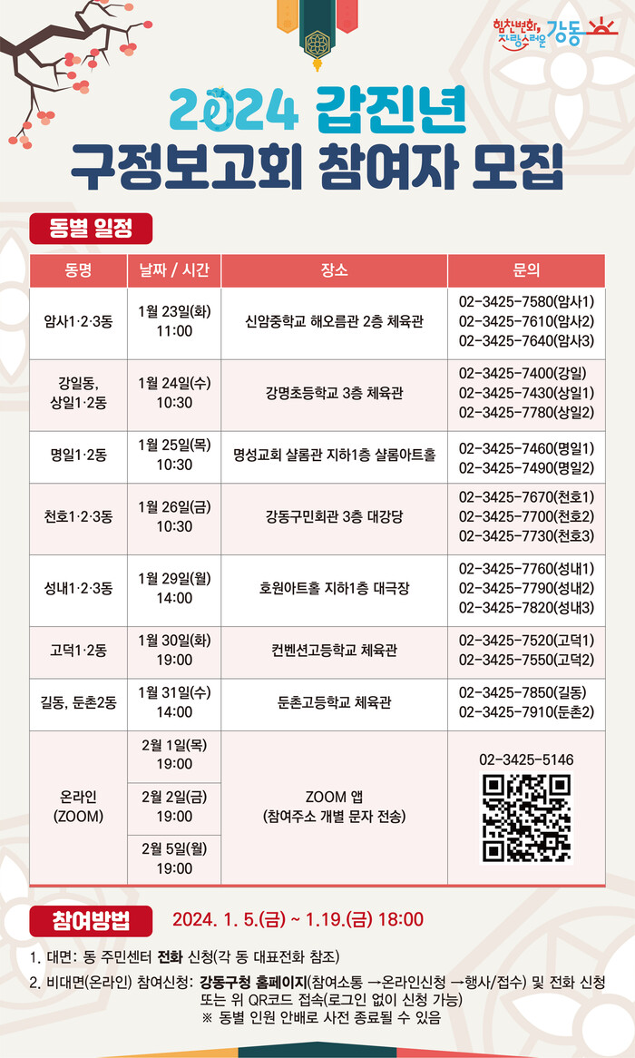 ‘2024 갑진년 구정보고회’는 암사동을 시작으로 7개 권역에서 진행되며, 직장인‧자영업자들도 참여할 수 있도록 비대면(온라인)으로도 운영한다.