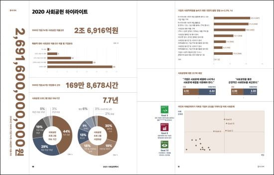 | ▲‘2021 사회공헌 백서, 사회공헌의 전환 : The way to ESG’의 하이라이트. 여기에는 2020년 사회공헌 활동의 다양한 정보들이 나타나 있다. (사진=한국사회복지협의회) |