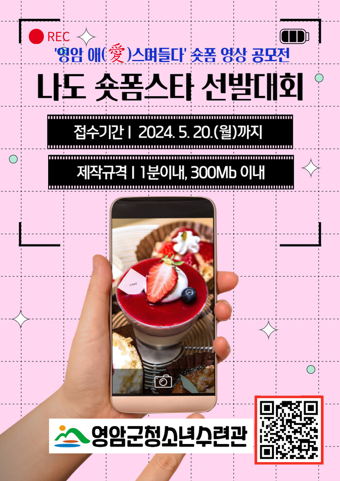 ‘영암 愛 스며들다’를 주제로 진행되는 이번 공모전은, 영상과 창의예술 분야 재능 있는 9~18세 영암군 청소년이 이룬 팀이 공모에 참여할 수 있고, 영암의 놀거리, 먹거리, 볼거리 등 지역자원을 활용해 짧지만 개성 있고 참신한 숏폼(short-form) 영상을 제작·제출하면 된다.