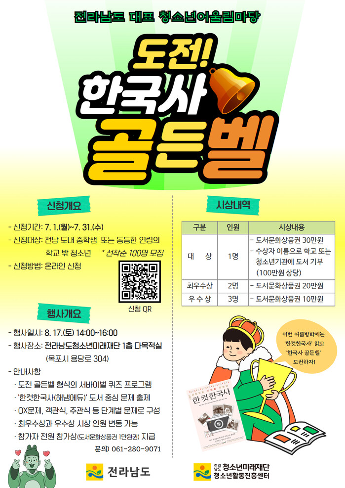 전남도가 주최하고 전남도청소년미래재단이 주관하는 ‘2024년 전라남도 대표 청소년 어울림마당’의 일환으로 운영되는 ‘도전! 한국사 골든벨’은 전남도내 중학생 또는 동등한 연령의 학교 밖 청소년을 대상으로 100명의 참가자를 모집한다.