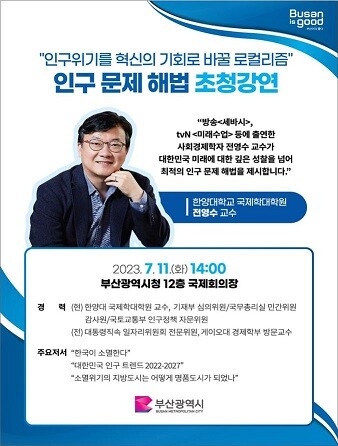 특히, 이번 행사에서는 방송 ‘세상을 바꾸는 시간, 15분’, ‘미래수업’에 출연한 한양대학교 국제대학원 전영수 교수를 초청하여, 인구문제에 대한 위기의식과 관심을 높이고 차별화된 지역 특화 사업을 발굴할 수 있도록 ‘인구 위기와 지방주의(로컬리즘)-부산의 선택’을 주제로 강연을 개최한다.