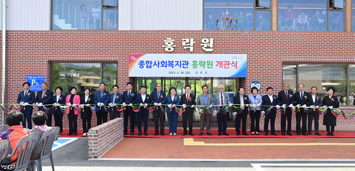 [진주=엄기동 기자] 진주시는 28일 문산읍 월아산로1048번길 26-11에서 조규일 진주시장과 국회의원, 도·시의원, 노인복지 관계자, 지역사회단체장, 시민 등 100여 명이 참석한 가운데 종합사회복지관 홍락원 개관식을 가졌다.