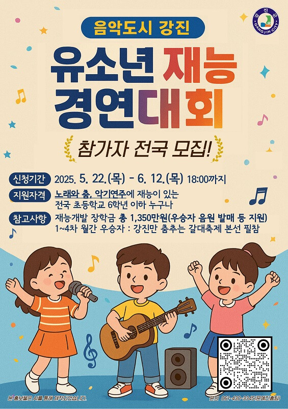 예선 참가 신청은 오는 6월 12일까지 온라인 네이버 폼으로 진행되며 관련 내용은 강진군 누리집 고시공고를 통해 자세히 확인할 수 있다.