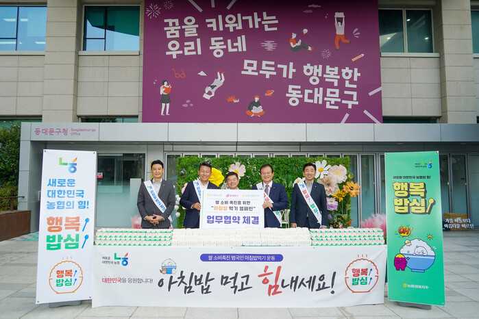 [시민일보 = 이대우 기자] 동대문구(구청장 이필형)는 8일 오전 농협서울본부(본부장 김상수) 및 동서울농협(조합장 장만선)과 ‘아침밥 먹기 상생협력 협약’을 체결하고, 300만원 상당의 쌀과 200만원 상당의 떡을 기탁받았다고 밝혔다.