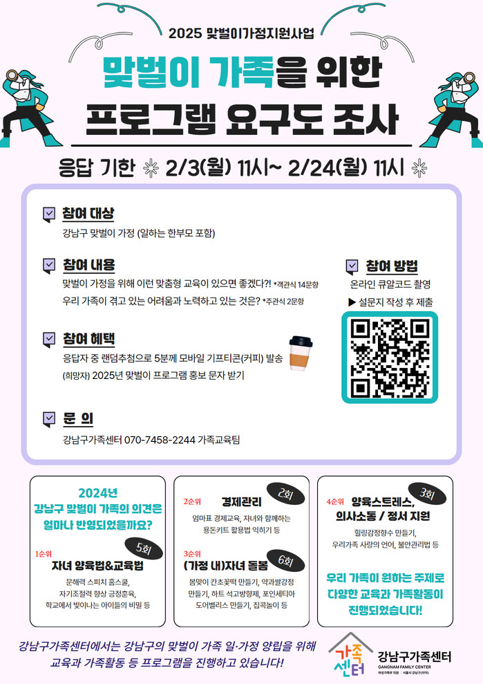 맞벌이라면 누구나 참여할 수 있고 설문에 참여한 이들 가운데 5명을 무작위 추첨해 기프티콘을 증정하며 당첨자 발표는 2월 24일 이후 개별안내 및 강남구가족센터 홈페이지를 통해 공개된다.