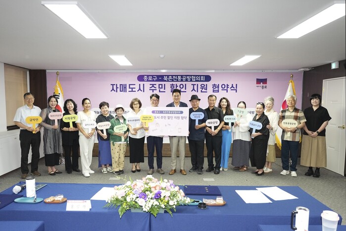 구는 7월 25일 구청장실에서 북촌전통공방협의회 소속 18개 공방과 「자매도시 할인혜택 지원 업무협약」을 체결했다.