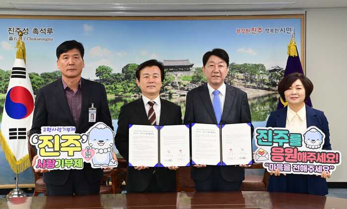 이날 조규일 진주시장과 우범기 전주시장은 협약식에 앞서 고향사랑기부금을 상호 기탁하고, 시청 5층 기업인의 방에서 협약서에 서명하며 상호협력을 약속했다.