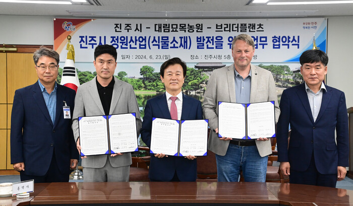 진주시는 23일 시청 5층 기업인의 방에서 충북 옥천군 소재 대림묘목농원 JB가든, 네덜란드의 브리더플랜츠(Breederplants)와 정원산업 발전을 위한 업무협약을 체결했다.