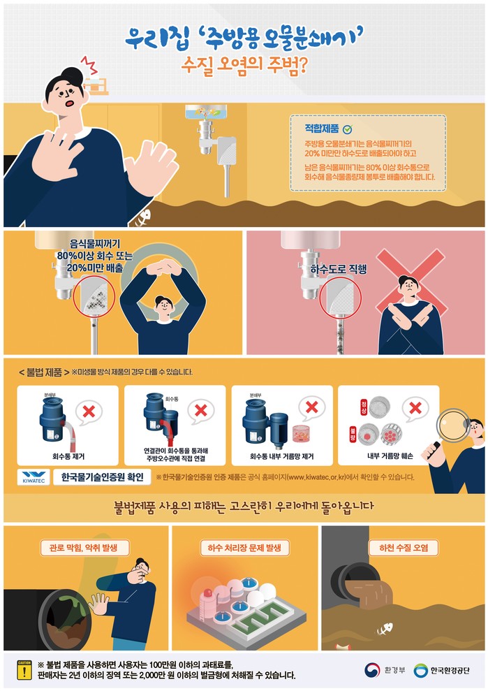 주방용 오물분쇄기는 임의로 조작할 수 없는 일체형으로 음식물 찌꺼기의 20% 미만만 공공하수도로 배출되고 남은 찌꺼기는 80% 이상 회수통으로 회수해 각 가정에서 음식물종량제 봉투로 배출시킬 수 있는 인증된 제품을 사용해야 한다.