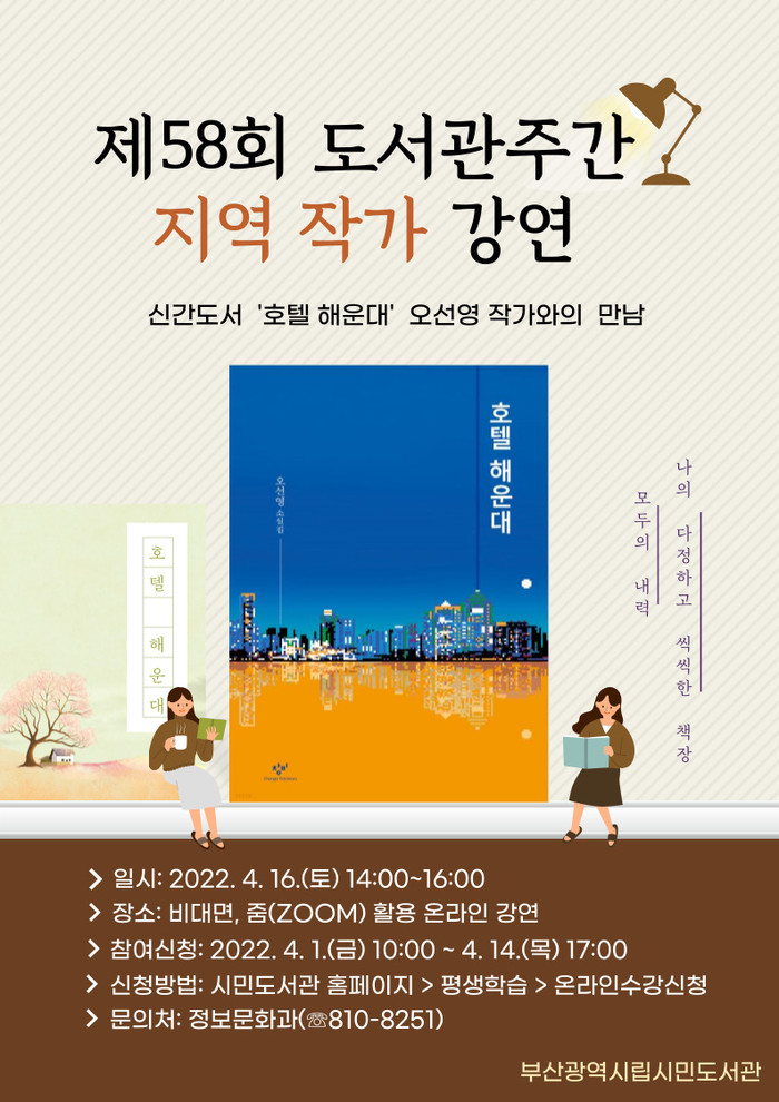 부산광역시립시민도서관(관장 김흥백)은 제58회 도서관 주간을 맞아 4월 16일 오후 2시 줌(ZOOM)을 활용해 ‘지역 작가 초청 강연회’를 연다.