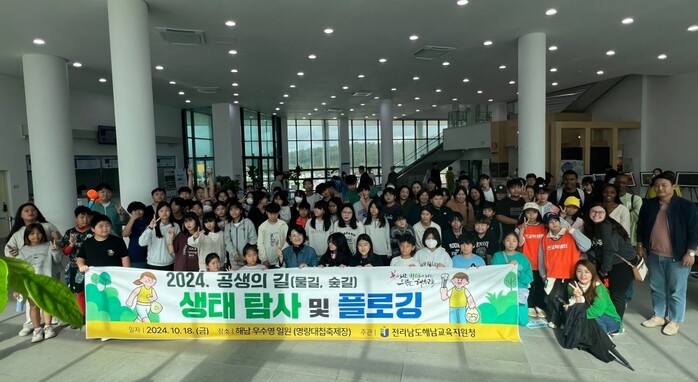 [해남=정찬남 기자] 전라남도해남교육지원청(교육장 이자영)은 지난 18일(금) 초, 중, 학부모, 교직원, 해남 ESG 회원 등 120명을 대상으로 명량대첩축제가 열리고 있는 우수영 관광단지 일원에서 ‘2024. 공생의 길(물길, 숲길) 생태 탐사 및 플로깅’을 실시했다.