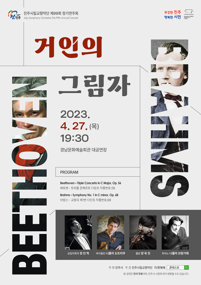 이번 공연은 ‘거인의 그림자’라는 부제로 상임지휘자 정인혁의 지휘와 첼리스트 양욱진, 바이올리스트 니콜라 도트리쿠, 피아니스트 니콜라 브랑기에의 협연으로 진행되며, 베토벤의 <트리플 콘체르토 다장조 작품번호 56>과 브람스의 <교향곡 제1번 다단조 작품번호 68>을 연주한다.