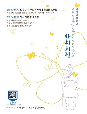 ▲부대행사로는 <기념전시회, 기념포럼>이 열린다. 기념전시회는 「부산지역 ‘위안부’ 피해 할머니들의 생애사」라는 주제로 8월 14일 오후 1시부터 영화의전당 6층 로비에서 개최되며, 포토존 및 시민참여 이벤트도 있을 예정이다. 기념포럼은 <일본군 ‘위안부’ 문제의 역사 정의와 지역의 모색>이라는 주제로 내일(10일) 오후 2시 유라시아플랫폼 109호에서 열릴 예정이다.