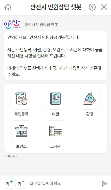 상담 서비스는 안산시청 누리집(홈페이지)의 ‘민원챗봇’을 통해 이용이 가능하며, 모바일에서도 동일하게 이용이 가능하다.