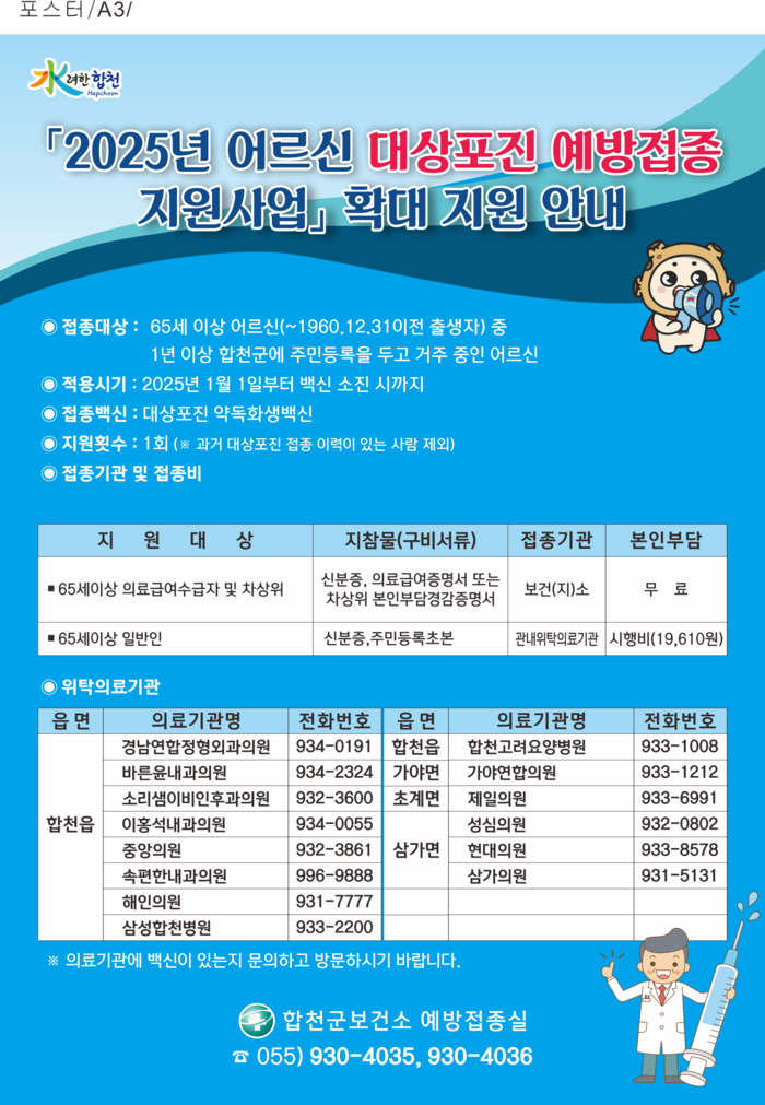 합천군보건소는 1년 이상 합천군에 주민등록을 둔 65세 이상 어르신(1960년 12월 31일 이전 출생자) 중 의료급여수급자 및 차상위본인부담경감대상자에 한해 보건(지)소에서 접종을 지원한다. 일반인은 관내 위탁의료기관에서 접종할 수 있다.