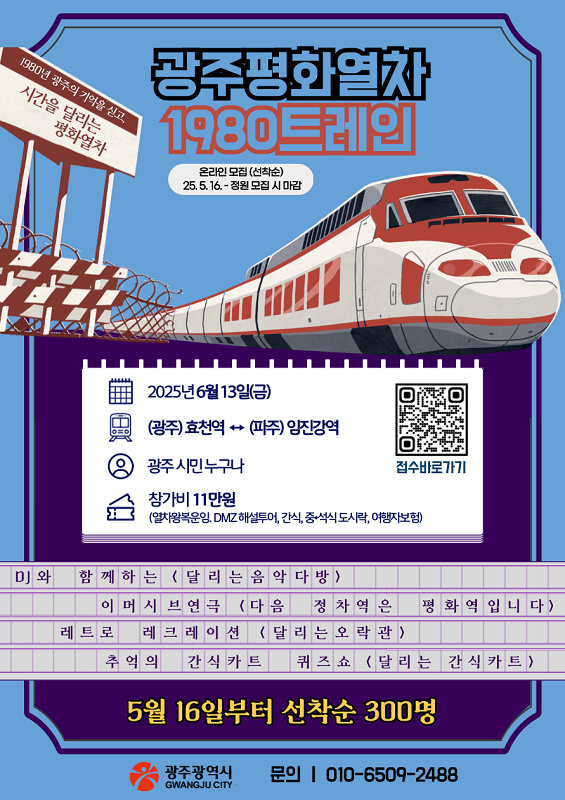 열차에서는 ‘1980년 5월을 주제로 한 음악다방’, ‘추억의 간식 퀴즈’, ‘연극 공연’ 등 시민 참여형 문화 콘텐츠가 진행된다. 임진강역 도착 후에는 파주시 DMZ 일원에서 안보현장 견학이 이어져 분단 현실을 직접 마주하고 평화‧통일의 의미를 되새기는 시간을 갖는다.