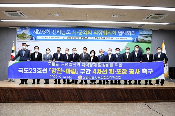 지난 14일 순천에서 개최된 제273회 전남시군의장협의회에서 김보미 의장이 대표 발의한 ‘국도 23호선 강진~마량 간 4차선 확ㆍ포장 촉구 건의안’이 전원 만장일치로 통과하며, 협의회 안건으로 채택됐다.