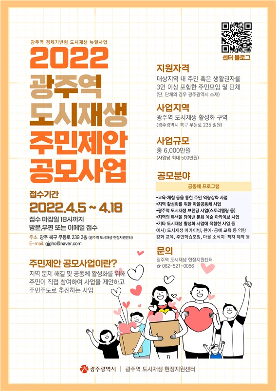 ‘광주역 도시재생 주민제안 공모사업’은 주민이 직접 제안하고 실행하는 사업으로 올해 사업비는 6000만 원이며, 사업당 최대 500만 원을 지원한다. 신청 자격은 광주역 사업권역 내 3인 이상 주민·생활권자(모임) 또는 단체이며 신청기간은 5일부터 18일까지다.