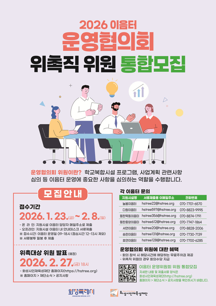 | ▲ 2026년 이음터 학교복합시설 운영협의회 위촉직 위원’ 통합 모집 안내 포스터 /자료제공=화성시인재육성재단 |