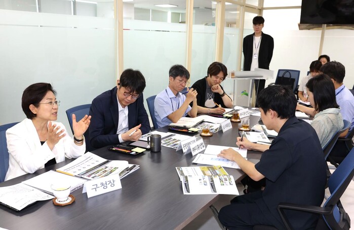 | ▲ ‘은평구 공공디자인 진흥계획 수립 용역 최종 보고회’에서 김미경 은평구청장을 비롯한 관계자들의 회의 진행 모습.(사진=은평구청 제공) |