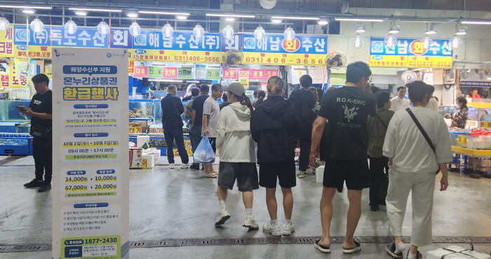 이번 행사는 해양수산부 지원으로 수산물 소비촉진과 도매시장 이용 활성화를 위해 마련된 것으로, 수산동 26개 점포가 참여해 국내산 수산물 구매 시 구매금액의 일부를 온누리상품권으로 즉시 환급하는 혜택을 선보였다.