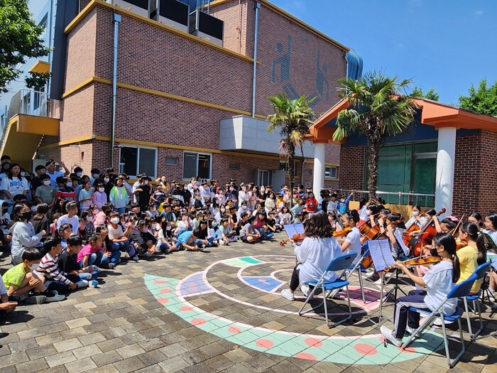 | ▲ 해남동초등학교오케스트라부, 지난 5월 31일 교내에서 2023년 ‘해남동 버스킹 문화제’ 5월 공연에서 오케스트라부 버스킹 공연 / 해남동초등학교 제공 |