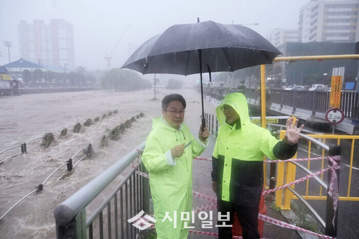 [광주=정찬남 기자] 강기정 광주광역시장이 호우 경보가 발효된 지난 17일 오후 서구 양동복개상가 앞 태평교에서 광주천 수위 현황 등 재해 우려지역 현장을 점검하고 있다. /광주광역시 제공