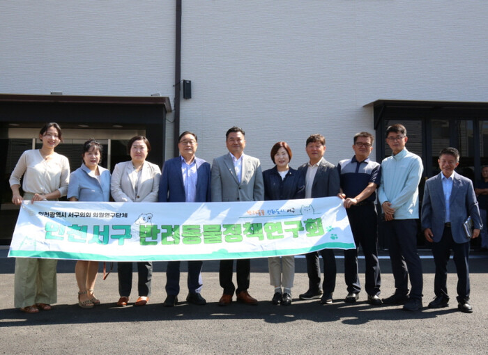 | 인천시 서구의회 반려동물정책연구회 현장 방문 참가자들이 포즈를 취하고 있다. |