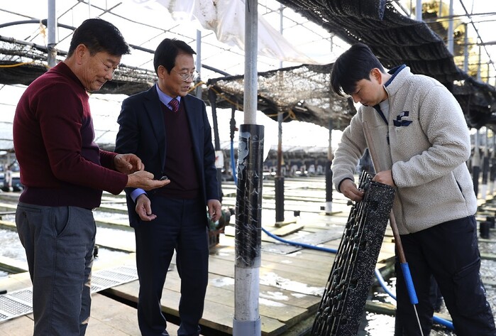 | ▲ 강진원 강진군수(가운데)가 지난 5일, 마량면 전복 치패양식장을 방문해 전복치패 상태를 살펴보고 있다. / 강진군 제공 |