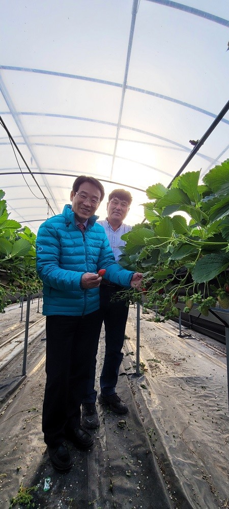 | ▲ 강진원 강진군수가 지난 9일 관내 딸기 재배농가를 방문해 이번주 출하를 앞둔 딸기의 작황을 살피고 있다. / 사진=강진군 제공 |