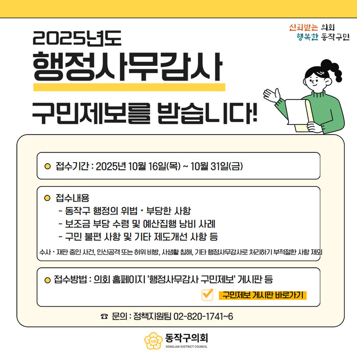 [시민일보 = 여영준 기자] 서울 동작구의회(의장 정재천)가 오는 11월25일부터 9일간 진행되는 ‘2025년도 행정사무감사’를 앞두고, 오는 31일까지 구민 제보를 접수한다.