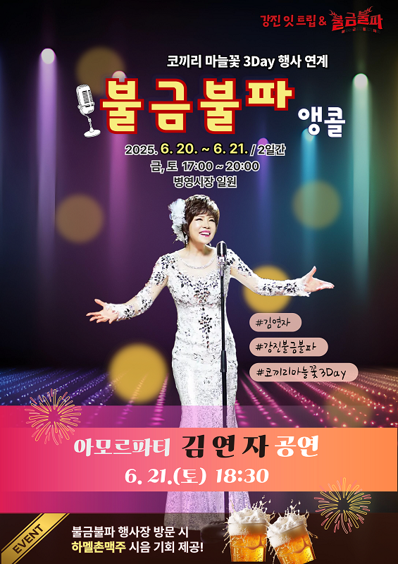 강진원 강진군수는 “이번 불금불파 앵콜 운영은 농번기 군민 노고를 위로하고 20일부터 열리는 작천 코끼리마늘꽃 3Day 행사와 연계해 관광객의 만족도를 높이기 위해 마련한 특별 행사이다”며 “특별히 작년 10월에 행사장을 화려하게 장식해 강진군을 널리 홍보해 준 ‘김연자’ 가수의 특별 공연으로 군민들이 행복하고, 외부 방문객들에게 행복한 강진에서의 여행으로 기억됐으면 좋겠다”고 말했다.