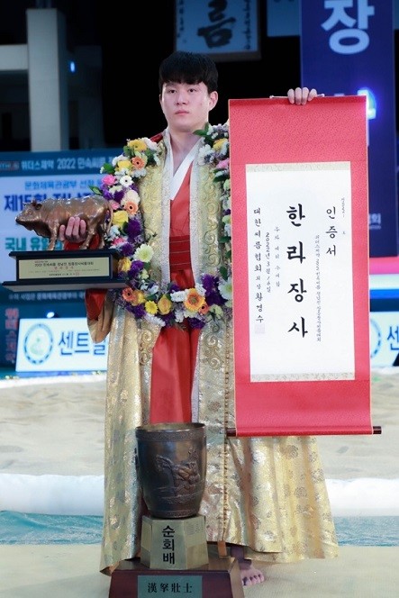 | ▲ 차민수 영암군민속씨름단 소속 선수가 지난 16일 2022 정남진 장흥장사씨름대회 결승에서 한라장사에 등극해 장사 인증서를 받고 기념촬영을 하고 있다. / 사진=영암군 제공 |