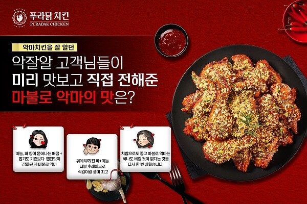 ‘마불로 악마’는 지난 9일 출시된 기존 악마 치킨의 업그레이드 버전 메뉴로 ‘마’늘과 ‘불’ 맛으’로’ 더욱 강력한 중독성을 선사하는 매운맛 치킨이다. 푸라닭 치킨만의 오븐-후라이드 방식으로 조리된 겉바속촉(겉은 바삭하고 속은 촉촉한) 치킨에 매력적이고 중독성 강한 새로운 맵단맛의 마불로 악마 소스가 더해져 푸라닭만의 차별화된 매운맛을 선사한다.