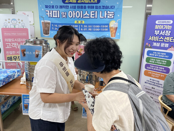 | ▲ 의왕도시공사 국민체육센터는 여름철 폭염에 대응하고 고객 감동을 실현하기 위해, 7월부터 8월까지 국민체육센터에서 ‘시원한 음료 나눔 행사’를 운영 중이다 /사진제공=의왕시 |