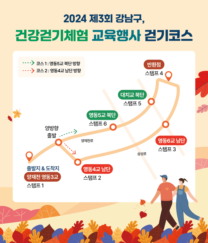 걷기 코스는 영동3교 북단에서 시작해 영동5교 북단 방향과 영동4교 남단 방향으로 나뉘며, 반환점을 돌아 다시 영동3교로 돌아오는 형태다. 코스 중간에는 6개의 건강체험 부스를 운영한다. ▲혈당 측정 ▲혈관·뇌 기능 등 신체기능 저하를 확인하는 자가공명분석 ▲귀를 통해 건강 상태를 확인하는 이어테라피 ▲스트레스 지수를 측정하는 마음건강관리 ▲자생한방병원 한방의료 지원과 지하이웰 체형분석프로그램 체험 등이 마련됐다. 각 부스를 방문할 때마다 스탬프를 찍고 최종 도착지까지 도착하면 소정의 상품을 제공한다. 참가를 원하는 구민은 구청 공지사항에 게시된 온라인 링크를 통해 신청할 수 있다.