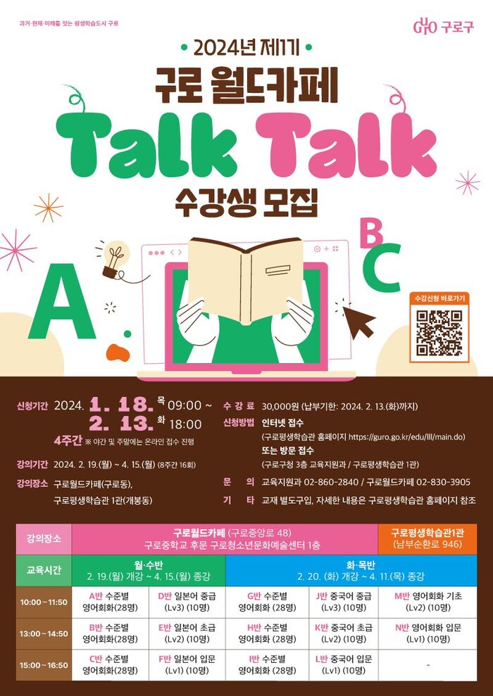 교육장소는 구로월드카페(구로중학교 후문, 구로청소년문화예술센터)와 구로평생학습관 1관(개봉동)이며 수강료는 3만원이다.