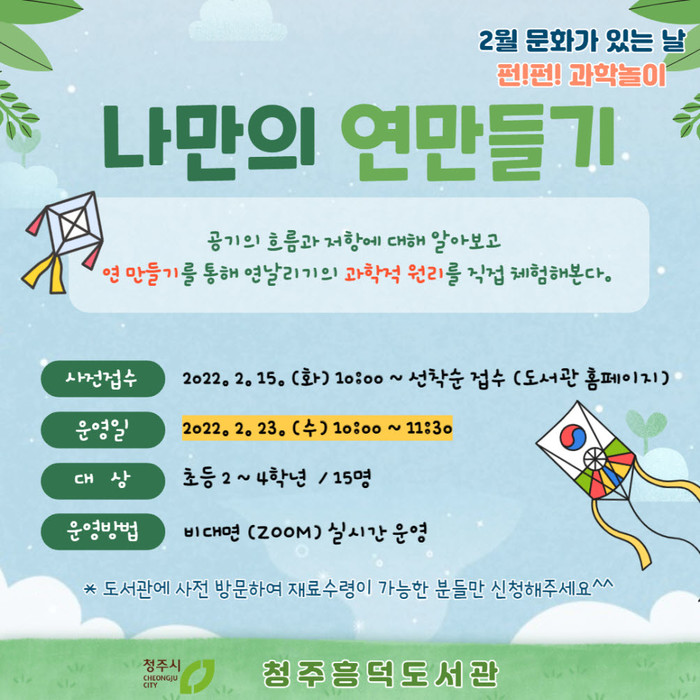 청주흥덕도서관은 ‘2월 문화가 있는 날’프로그램으로 마련한 ‘펀펀 과학놀이 - 나만의 연 만들기’체험 프로그램을 오는 23일 운영한다.