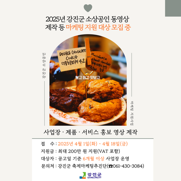 올해 신규 지원도 5개소로 상당한 경쟁이 예상돼 제작 상황에 따라 예산 내 최대한 많은 사업장이 지원받을 수 있도록 할 계획이다. 접수 방법은 '방문 및 등기 접수(사업장 소재지 읍·면 사무소)', '온라인 신청(강진군 누리집 "소상공인지원센터"에서 사업 선택 후 신청'이 있으며 오는 18일까지 가능하다.