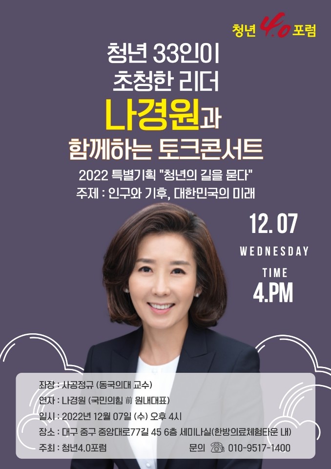 사공정규 청년4.0포럼 회장은 “청년4.0포럼 2022 특별기획 토크콘서트 피날레 연자로 평소 장애인 인권과 복지를 위해 노력해오고 저출산 고령사회 대응을 넘어 인구 미래전략을 생각하고 글로벌 의제인 기후 문제를 위해 노력하는 나경원 부위원장을 모시게 되어 영광”이라며 “이번 토크콘서트가 청년33인이 초청한 정치리더 나경원 저출산고령사회위원회 부위원장과 청년들의 열띤 토론의 장이 되어 많은 배움이 되고, 청년들의 꿈과 희망이 국정에 반영되기를 기대한다”고 말했다.