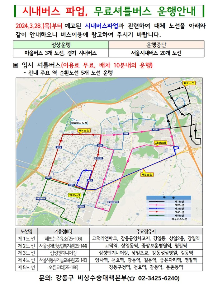 [시민일보 = 이대우 기자] 3월 28일 서울시내버스 노동조합이 파업을 진행한 가운데, 강동구(이수희 구청장)는 무료 셔틀버스 운행 등 비상수송 대책을 선제적으로 마련해 주민 불편을 줄이기 위해 총력을 기울이고 있다고 밝혔다.