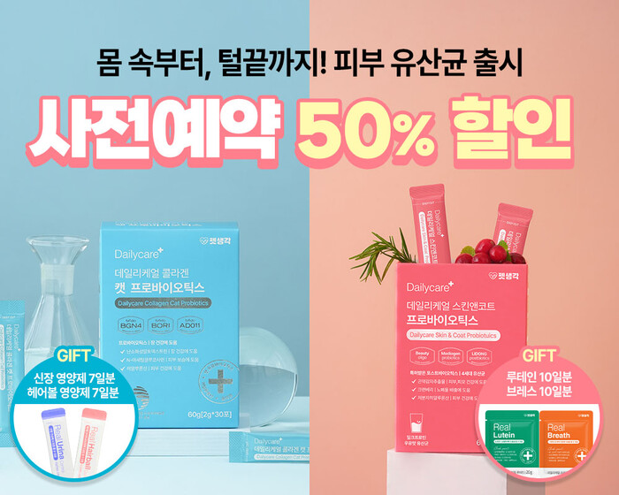 사전 예약으로 데일리케얼 고양이 유산균을 구매할 경우, ▲고양이의 헤어볼 영양제 7p, ▲신장 영양제 7p, ▲무료배송 그리고 ▲50% 할인 혜택으로 사전 예약 이벤트 기간 동안만 만원 초반대에 고양이 유산균을 만나볼 수 있다.