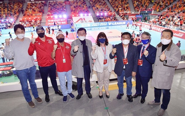 [광주=정찬남 기자] 이용섭 광주광역시장(좌측부터 네 번째)이 13일 오후 서구 염주종합체육관(페퍼스타디움)에서 열린 2021-22 도드람 V리그 여자부 2라운드 AI페퍼스와 현대건설의 홈경기에 참석해 마이클 컬헤인 페퍼그룹 CEO, 캐서린 레이퍼 주한 호주대사, 이병훈·민형배 국회의원, 조원태 한국배구연맹(KOVO) 총재 등 내빈들과 AI페퍼스 선수단의 승리를 기원하며 구호를 외치고 있다./광주광역시 제공