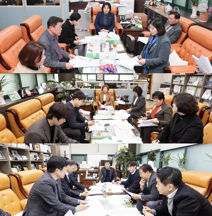 | ▲ 안산시의회 3개 상임위원회가 지난 20일 시 집행부와 간담회를 가졌다. 사진 위부터 차례대로 기획행정위원회와 문화복지위원회, 도시환경위원회가 간담회를 하고 있는 모습. 사진제공=안산시의회 |