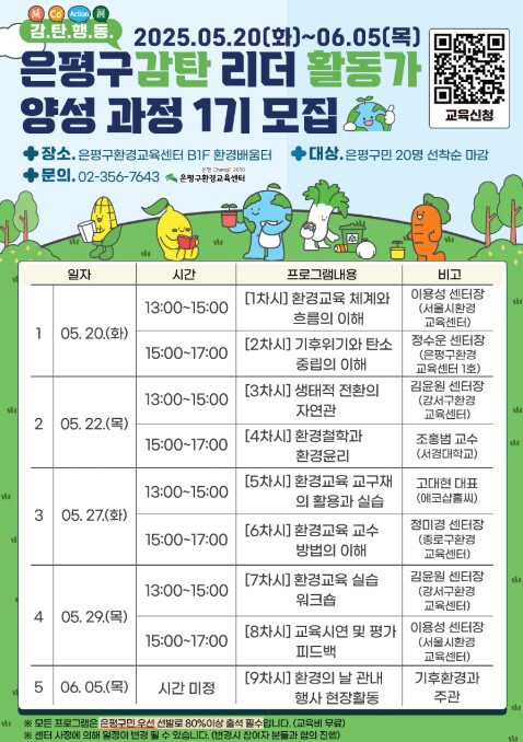 모집 대상은 탄소중립 실천 의지가 있는 은평구민으로, 선착순 20명이다. 교육은 공공형 은평구환경교육센터(은평 ChangE 2050)에서 진행되며, 교육 기간은 내달 20일부터 29일까지 총 8회차가 열린다.