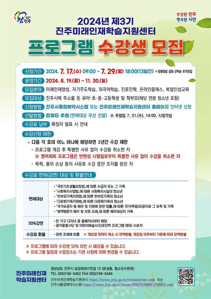 모집 및 프로그램에 관한 자세한 사항은 진주미래인재학습지원센터 홈페이지를 참고하거나 전화로 문의하면 된다.
