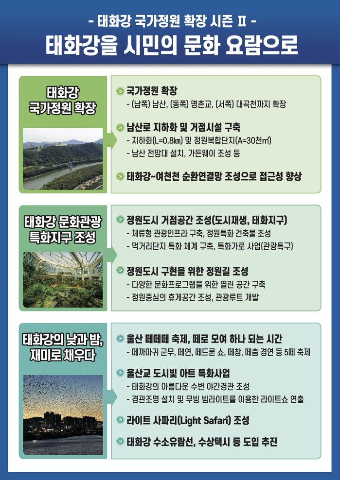 울산시는 ‘태화강 국가정원 비전Ⅱ’에서 태화강을 울산의 미래 친환경 문화⸱관광 신성장 동력으로 확고히 다지고 태화강을 세계 최고의 생태관광 명소로 발전시켜 나간다는 계획이다.