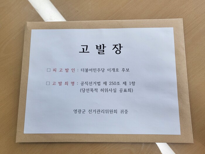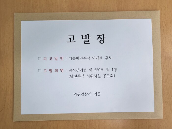 | ▲ 영광경찰서에 접수한 고발장(출처=이석형 후보 선거) |